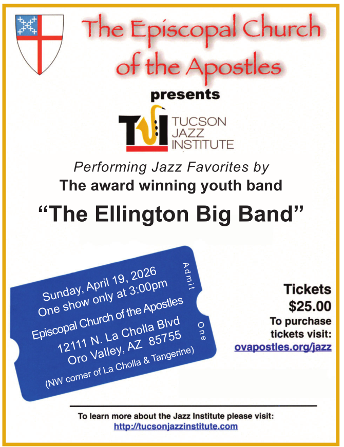 On Sunday, April 19th, 2026, Church of the Apostles in Oro Valley welcomes the Tucson Jazz Institute’s Ellington Big Band! Please join us for a performance by these incredibly talented young people!